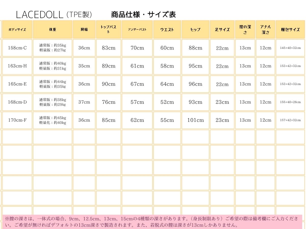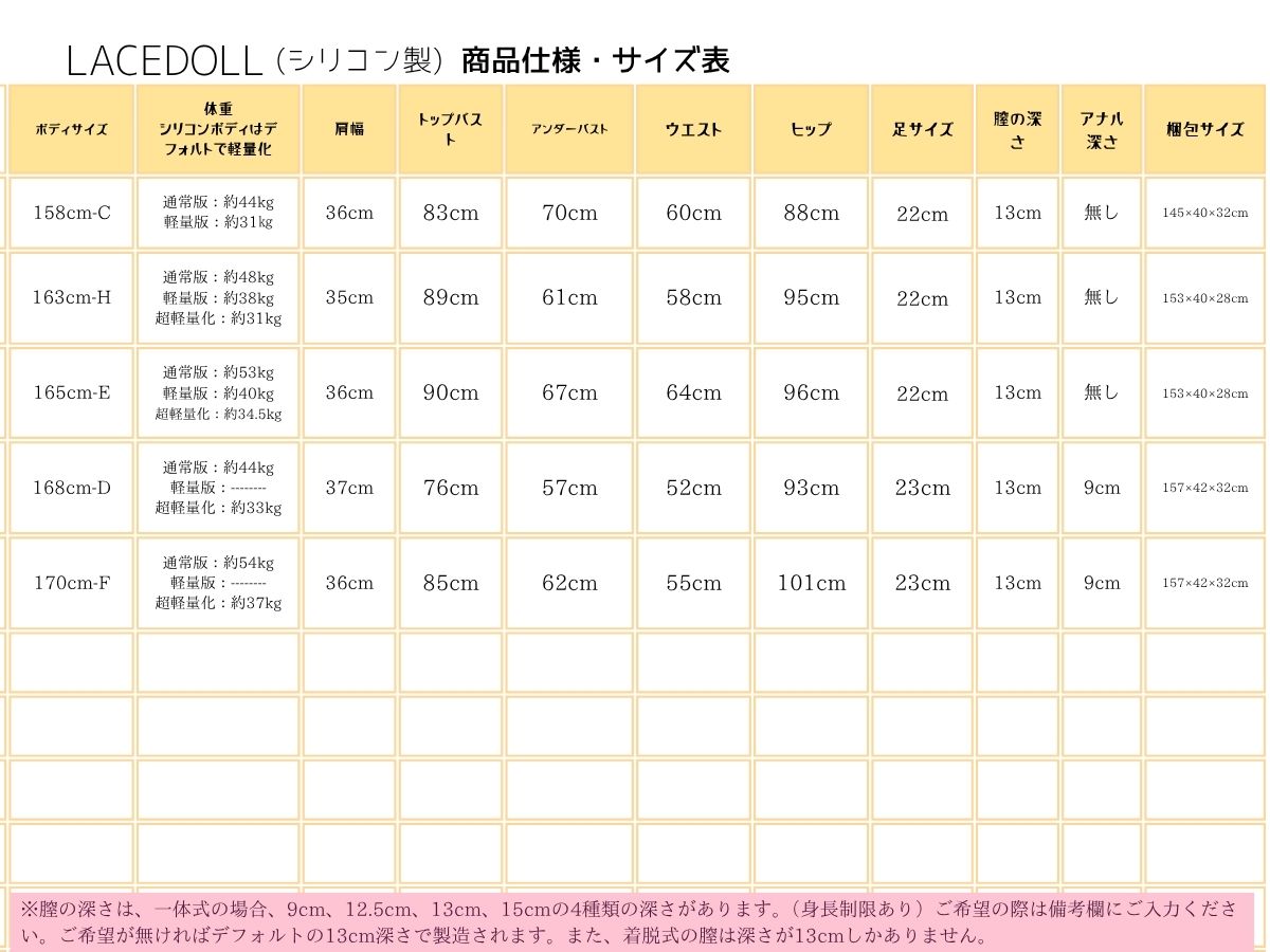 シリコン材質のボディは168cm以外、アナル穴無し