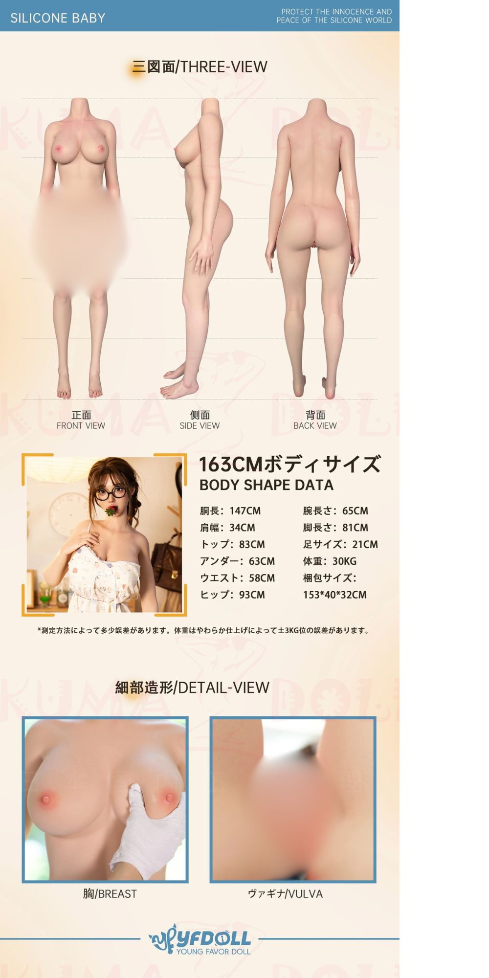 | 156cm Iカップ | 32cm | 33kg | 89cm | 59cm | 57cm | 94cm | 22cm | 選択可能 | 選択可能 | 硬質ヘッドは穴無し、口開閉機能付きの場合11cm | 153x40x32cm |